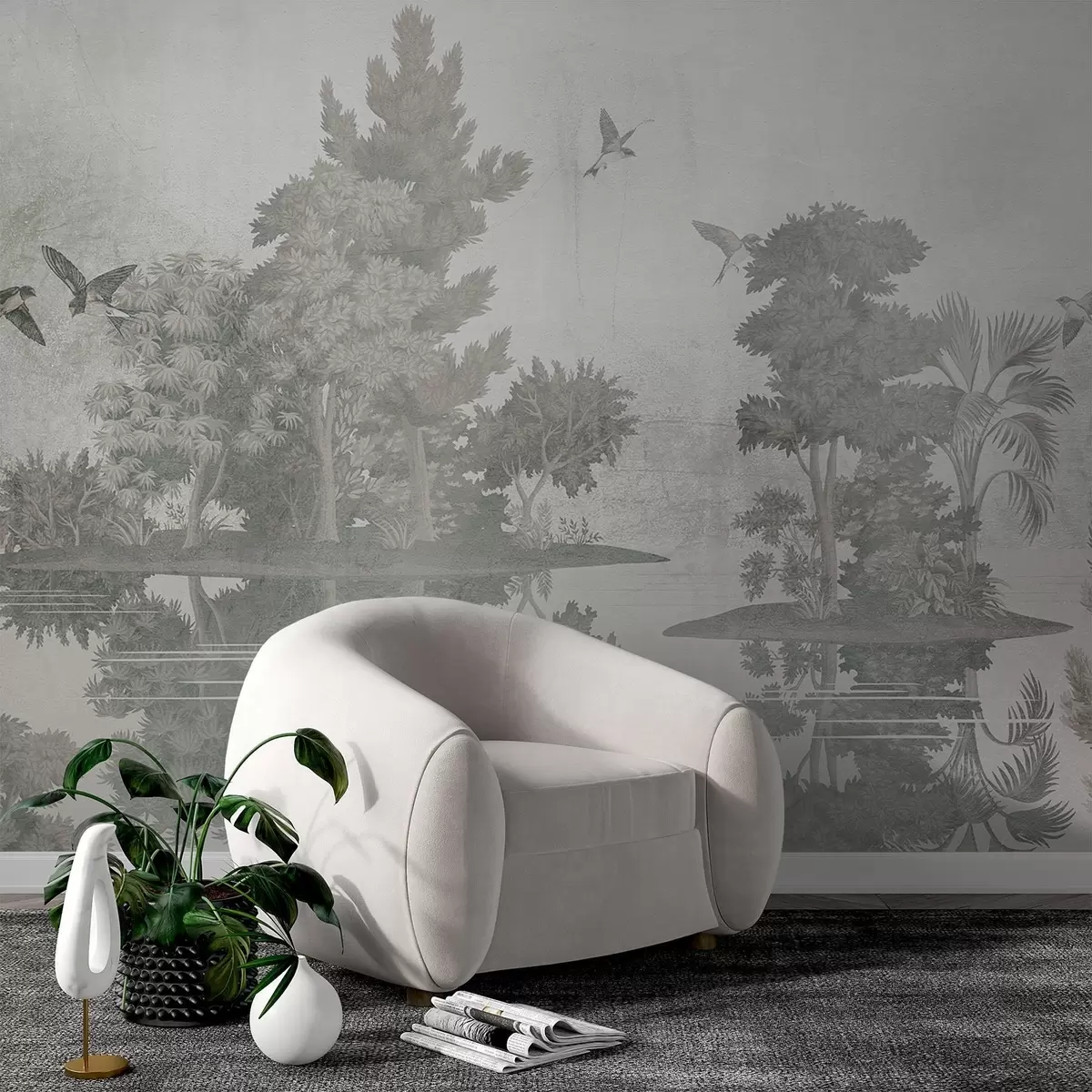 Papel tapiz Impresión de un paisaje forestal con un lago rodeado de pinos y otro follaje sobre un fondo verde texturizado Nr. w08426v1