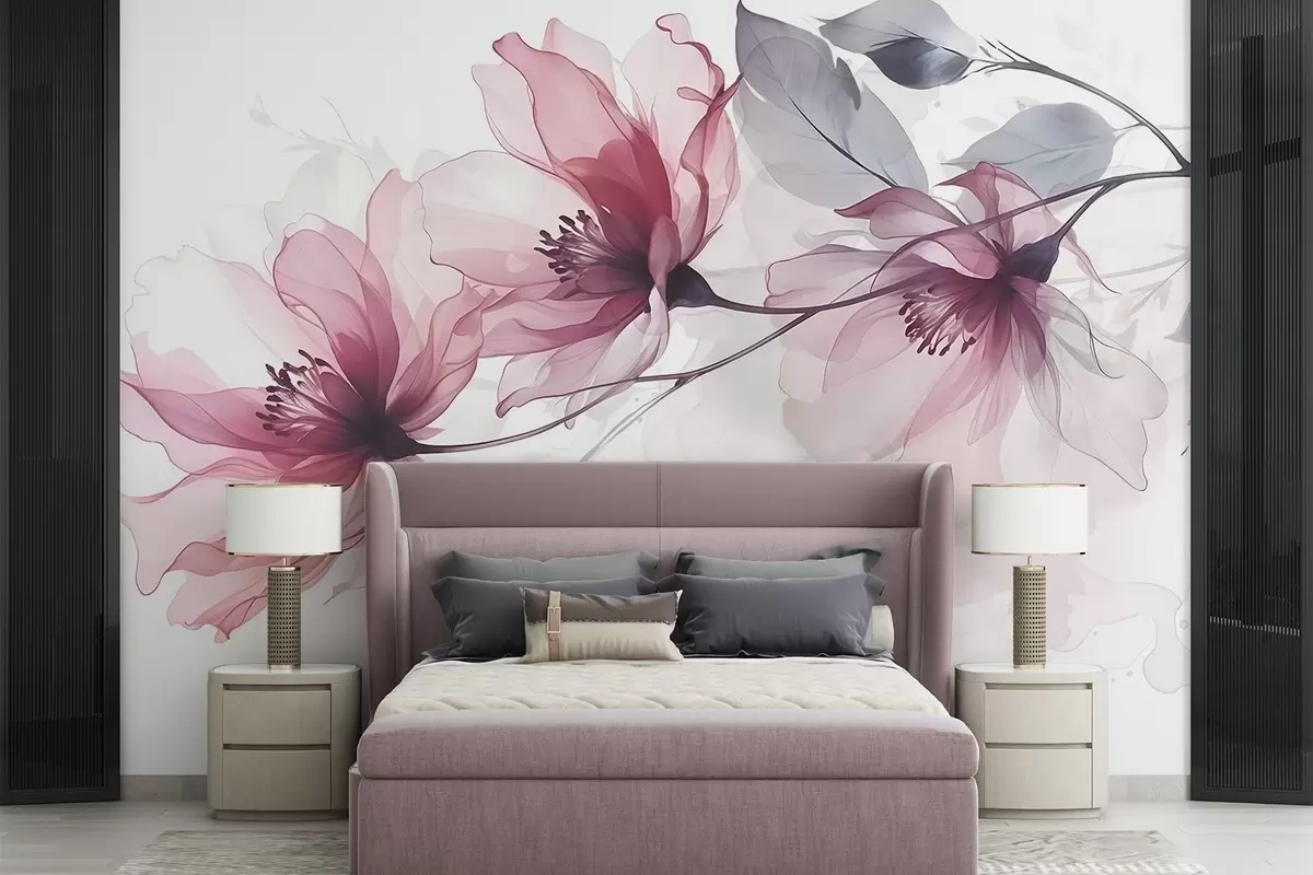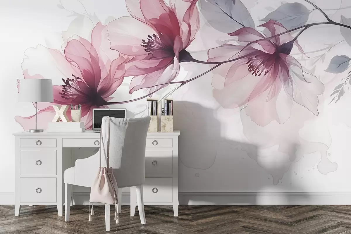 murales de pared Delicadas flores transparentes rosas y grises con pétalos suaves y difuminados sobre fondo blanco w08429