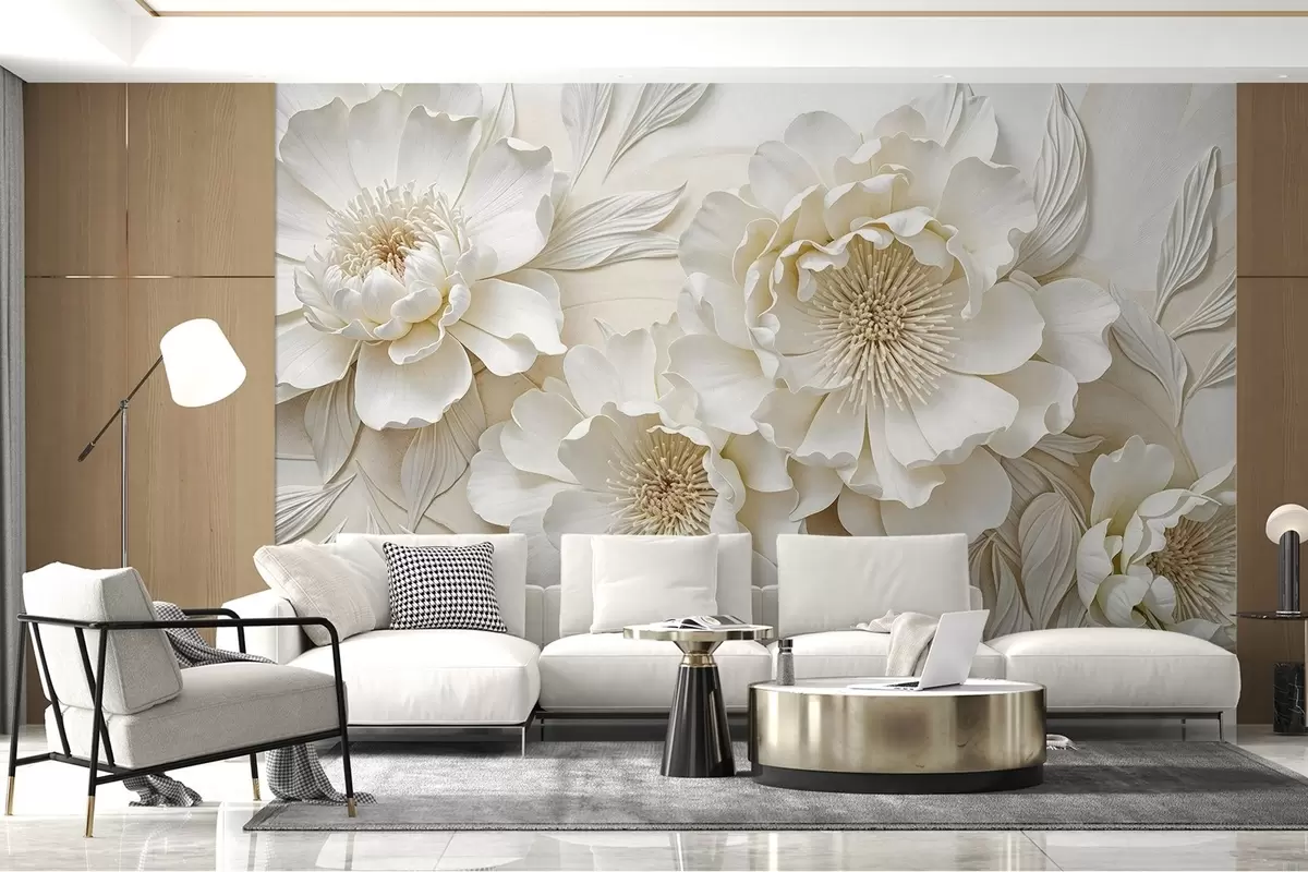 murales de pared Elegantes y voluminosas flores de imitación de peonía blanca con suaves pétalos y centros amarillo pastel, sobre un fondo claro w08431