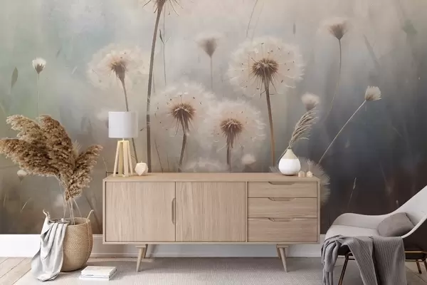 Papel tapiz Flores de diente de león suavemente enfocadas en un campo, con un fondo borroso de textura de color pastel Nr. w08432