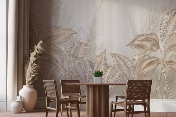 Papel tapiz Elegantes hojas de palmera blancas y beige sobre un fondo claro y texturizado Nr. w08434