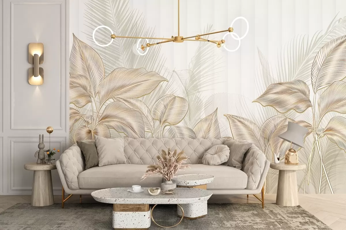 Papel tapiz Elegantes hojas de palmera blancas y beige sobre un fondo claro y texturizado Nr. w08434