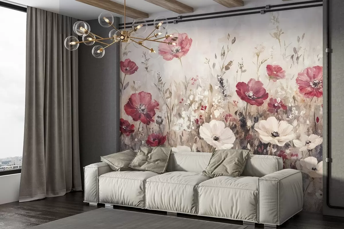 Papel tapiz Un campo de vibrantes flores rojas y blancas sobre un fondo suave y brumoso en estilo de pintura al óleo Nr. w08438