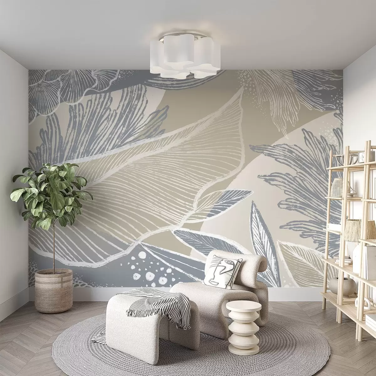 murales de pared Estampado abstracto en azul pastel y blanco con formas y líneas orgánicas y una paleta de colores apagados w08450
