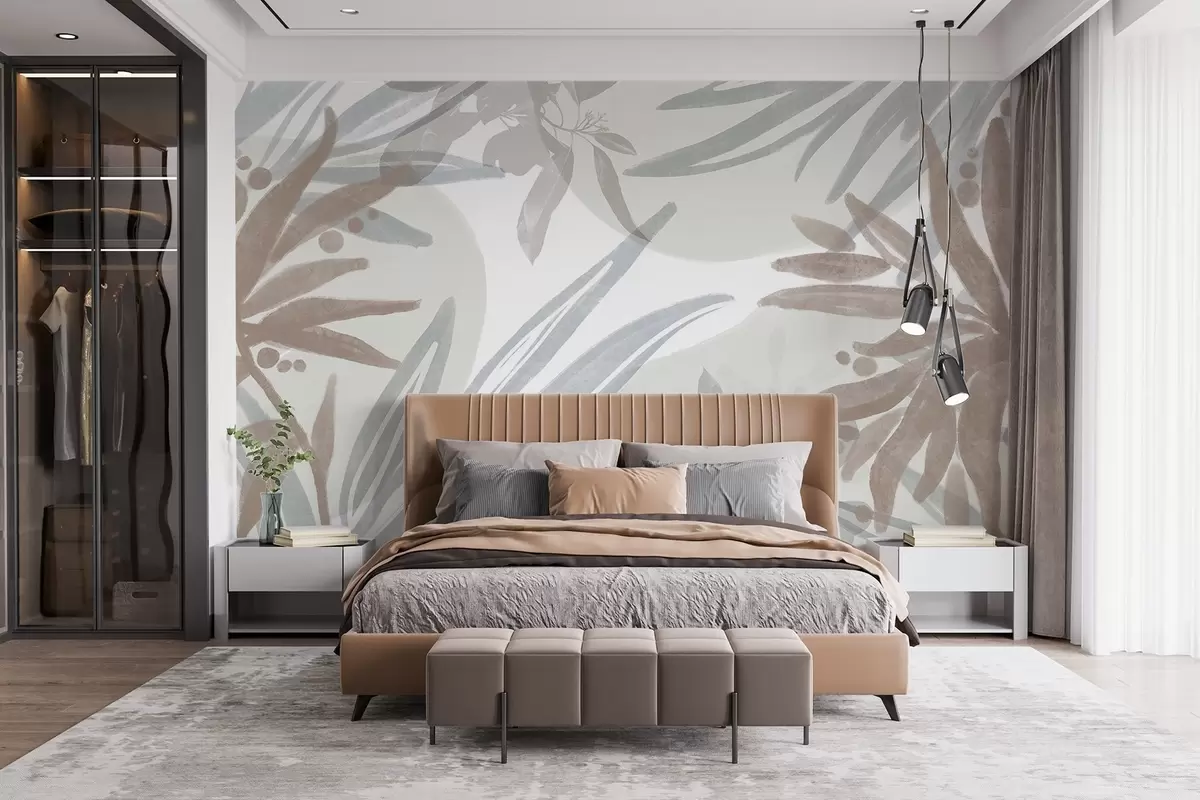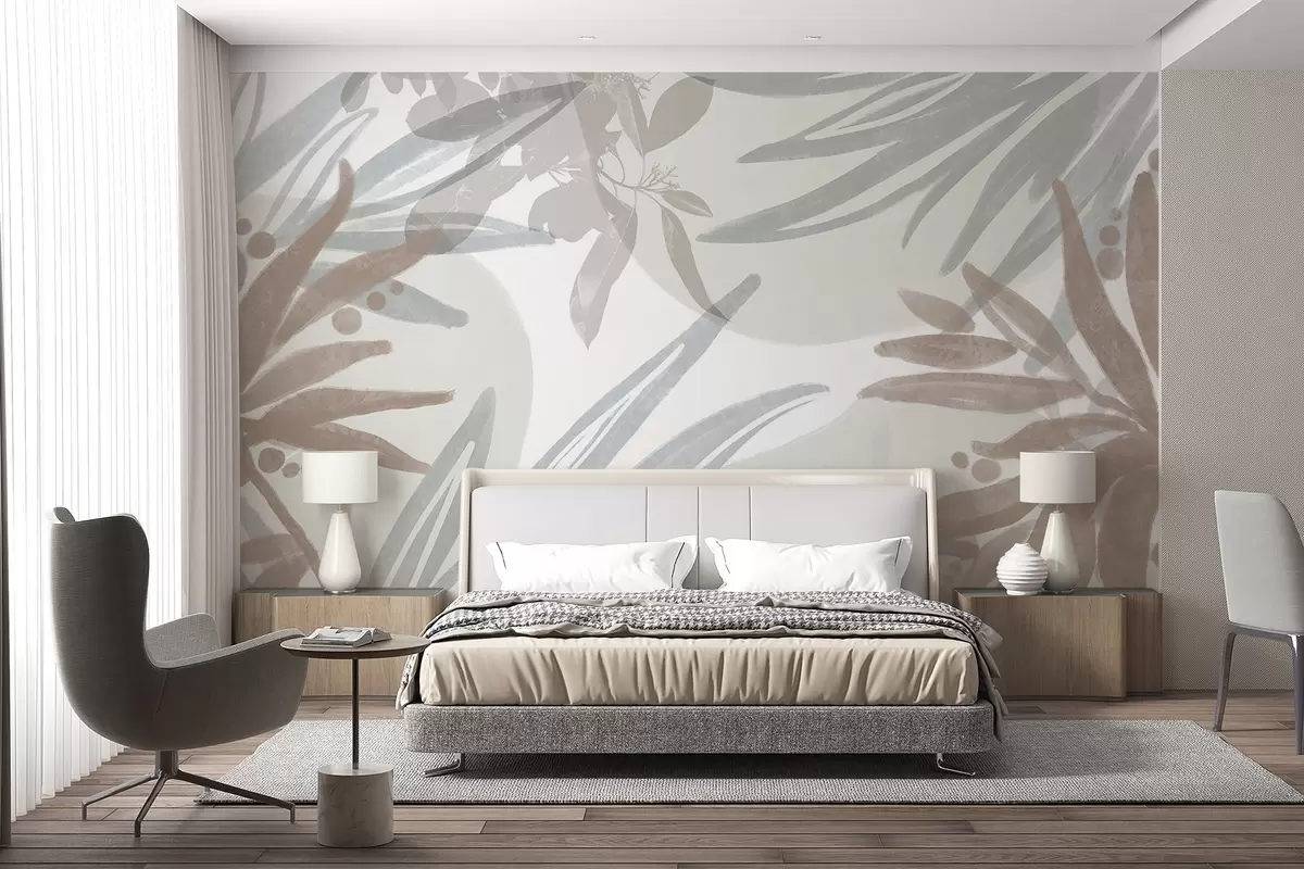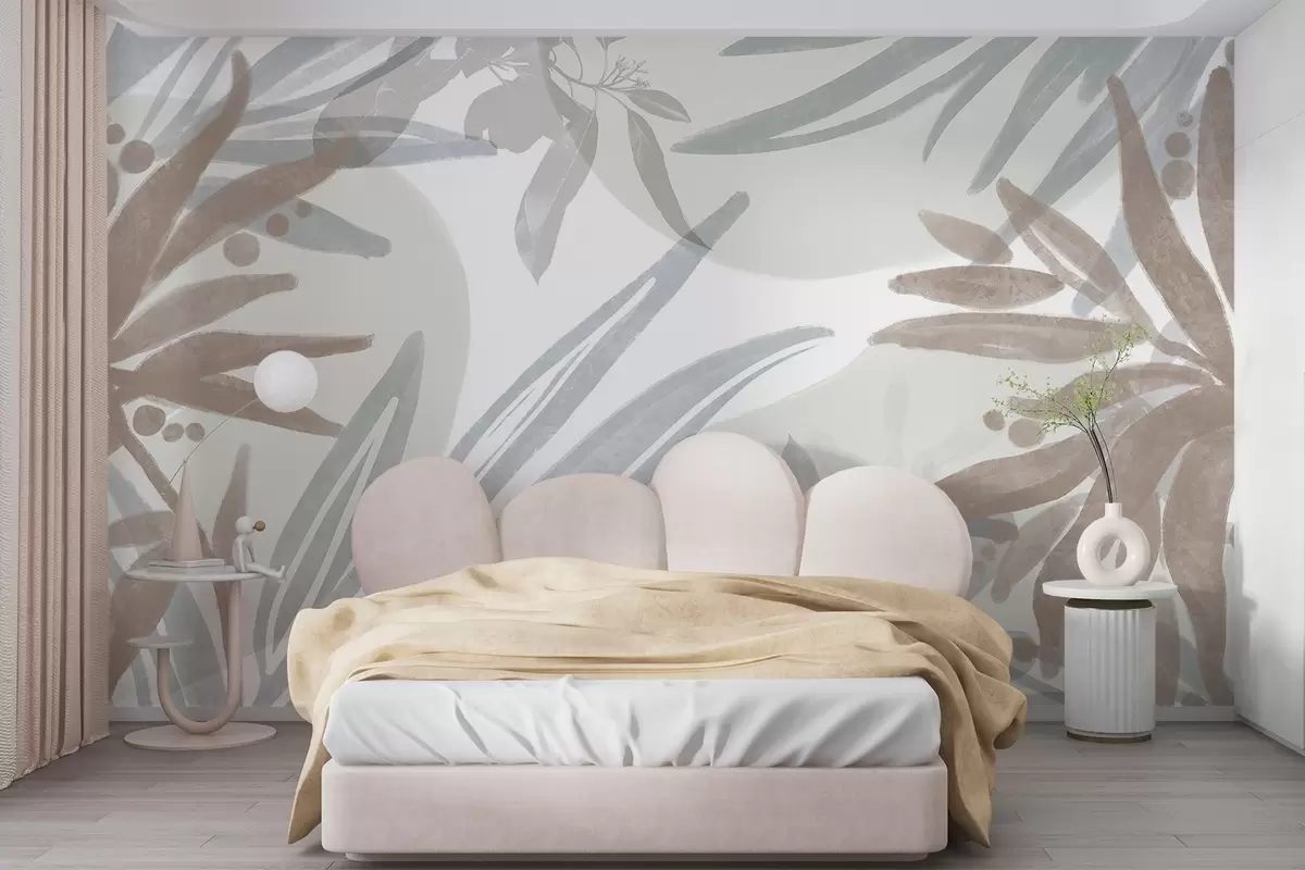 Papel tapiz Un motivo floral abstracto de tonos neutros con hojas y formas superpuestas en tonos grises, blancos y beige Nr. w08464