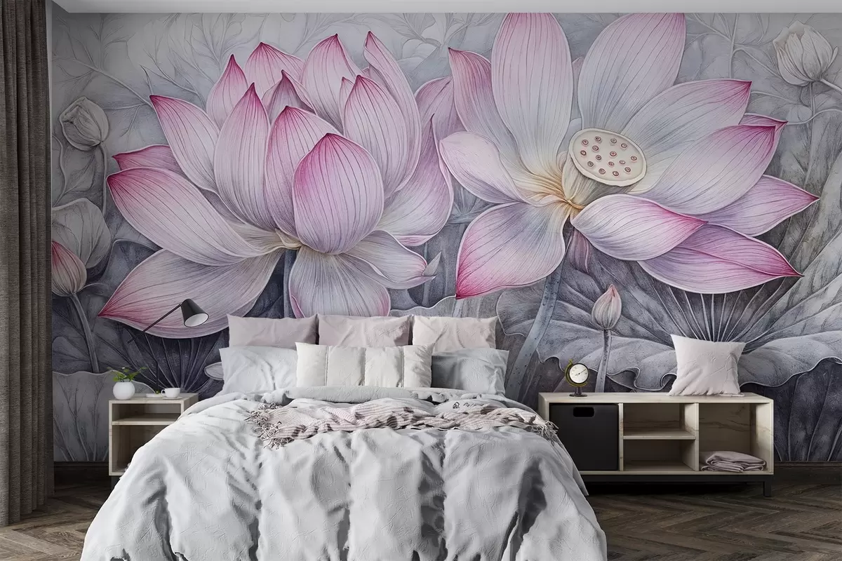 murales de pared Varias flores de loto rosas grandes con textura detallada y hojas y tallos de color verde grisáceo sobre un fondo claro w08465
