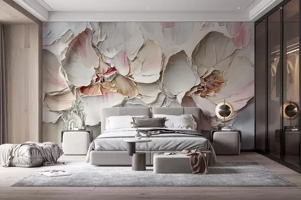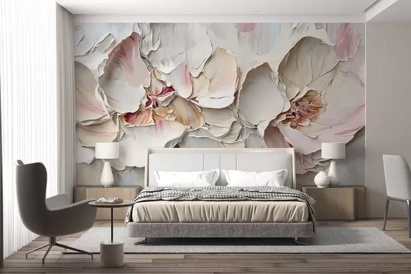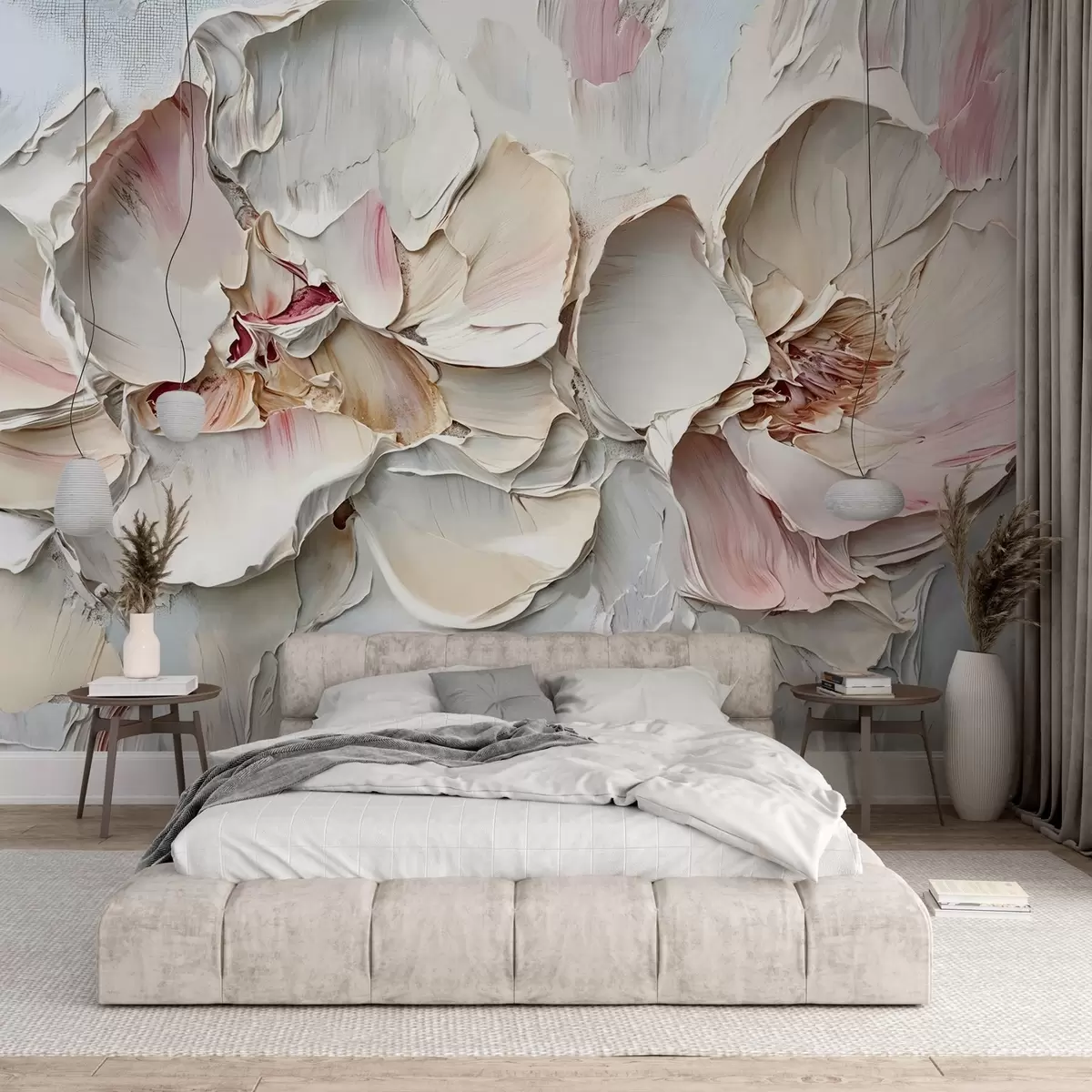 Papel tapiz Delicadas flores de color rosa pálido con suaves pétalos en capas sobre un fondo de textura apagada imitación de pintura al óleo empastada Nr. w08467