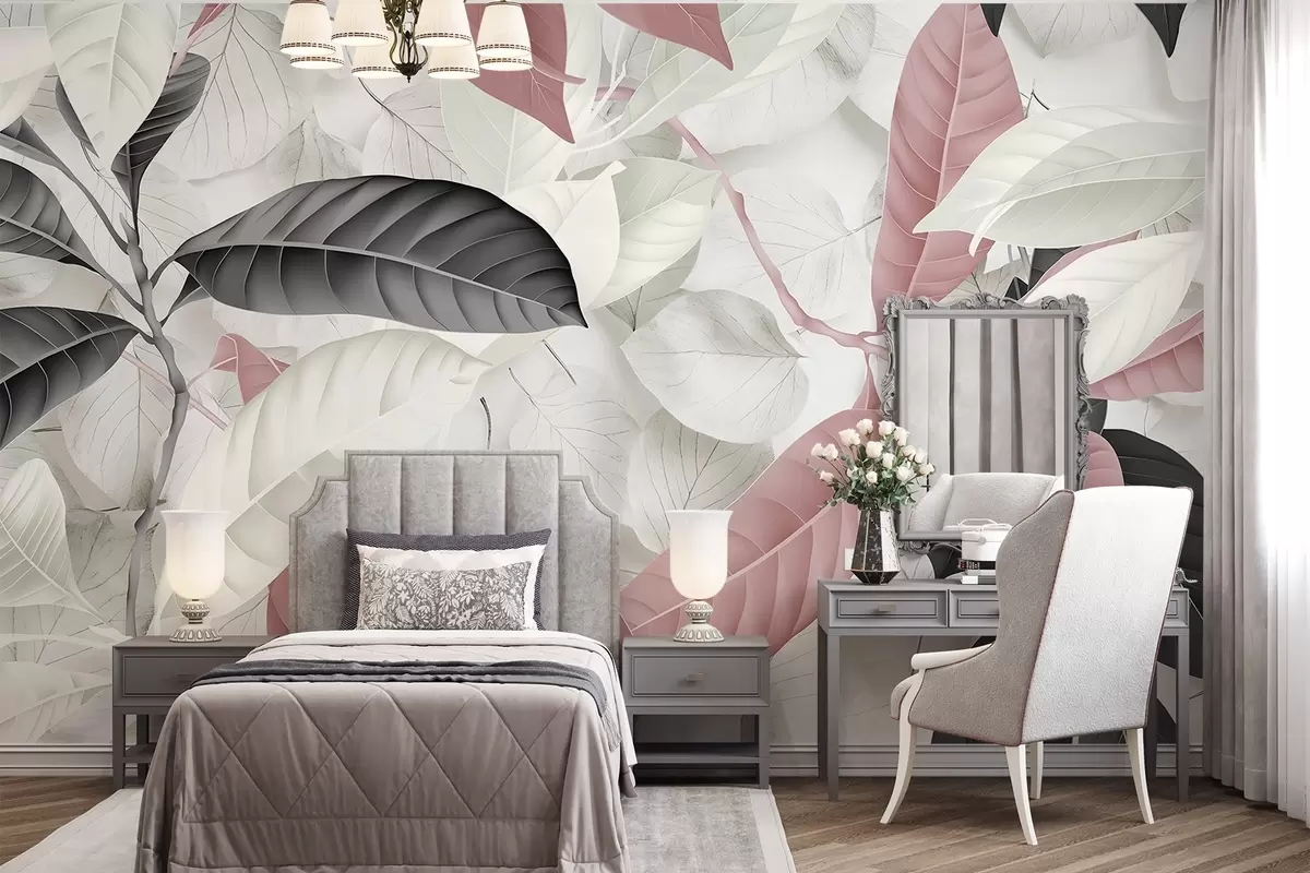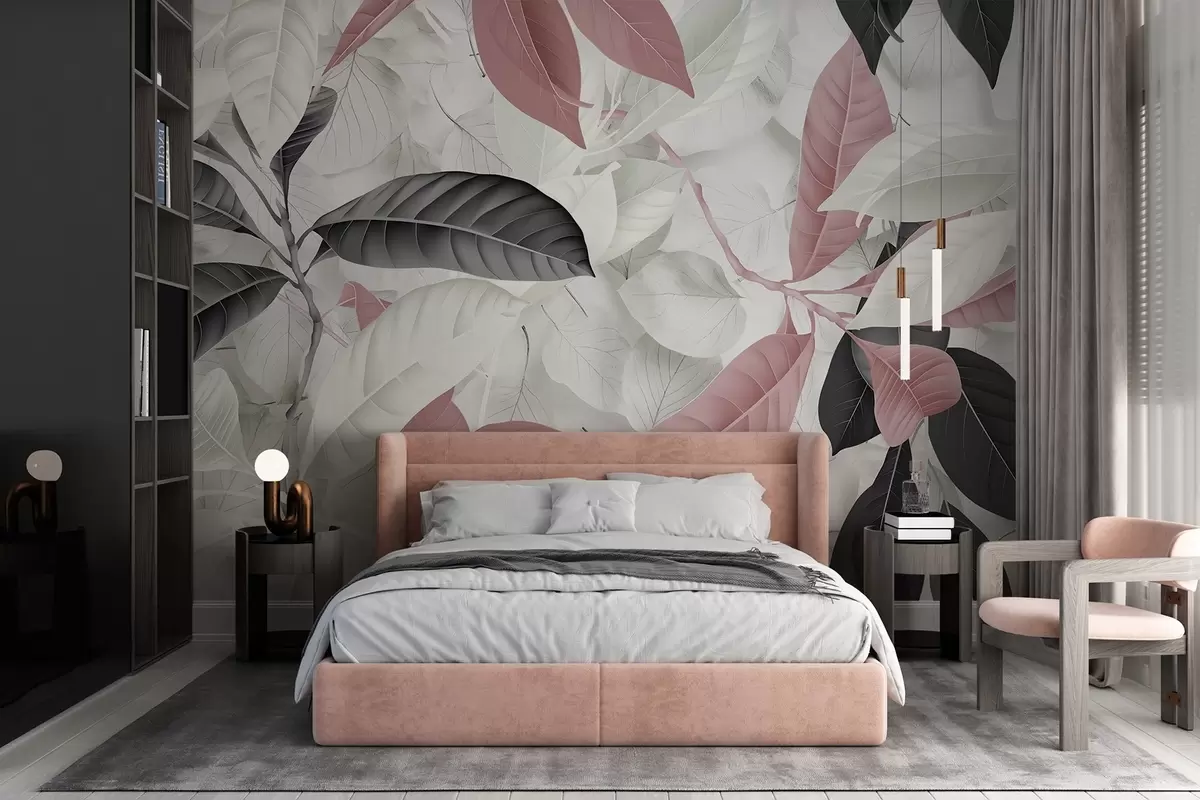 Papel tapiz Gran estampado de hojas rosas y grises sobre un fondo con textura de hojas claras, que crea una exuberante sensación tropical Nr. w08468