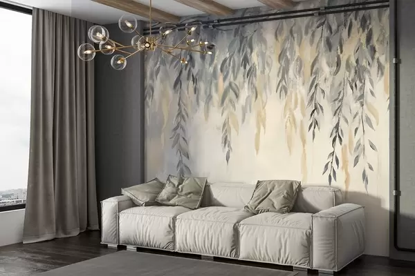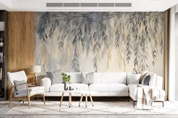 Papel tapiz Ramas de sauce con delicadas hojas colgando sobre un fondo de textura suave y difuminada Nr. w08473