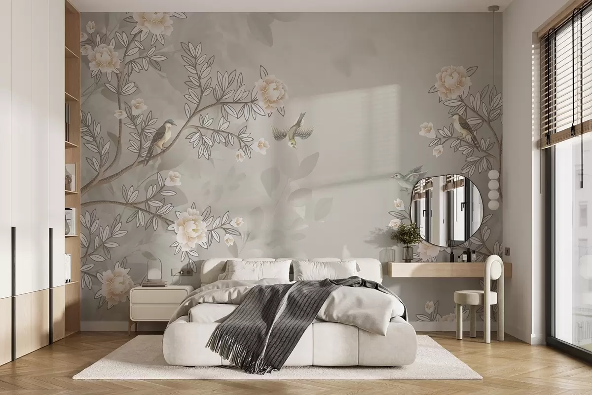 Papel tapiz Ramas con rosas y pájaros volando en tonos claros Nr. w08493