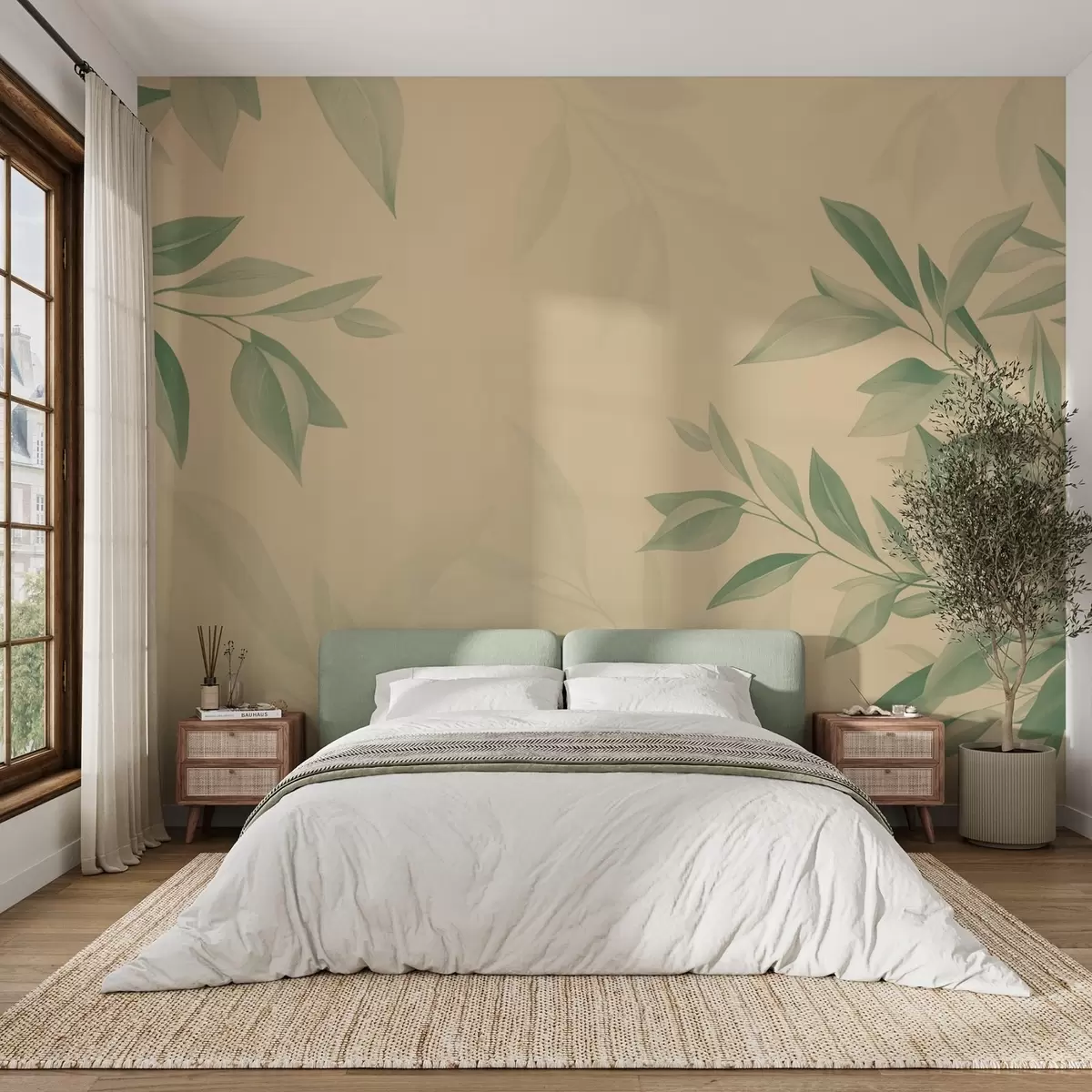 Papel tapiz Hojas verdes con un suave fondo beige cálido Nr. w08499v2