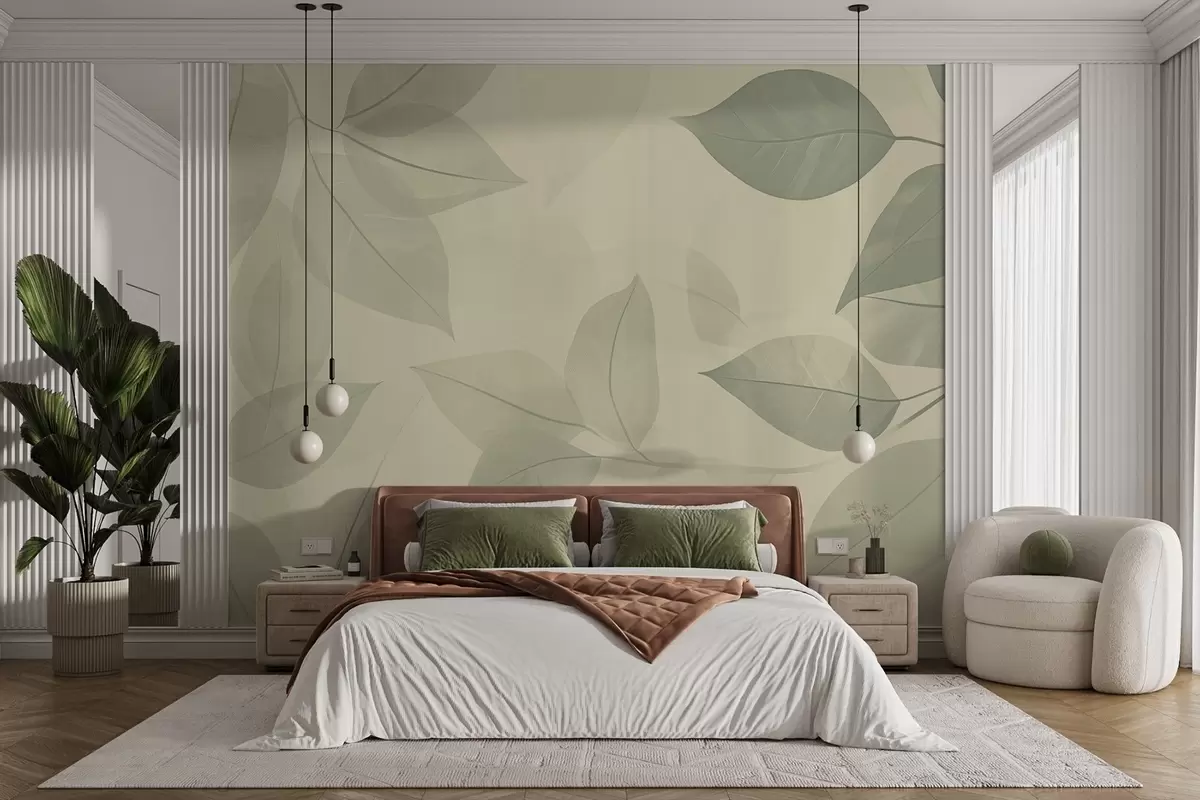 Papel tapiz Ramas de hojas verdes sobre fondo beige suave Nr. w08502v2