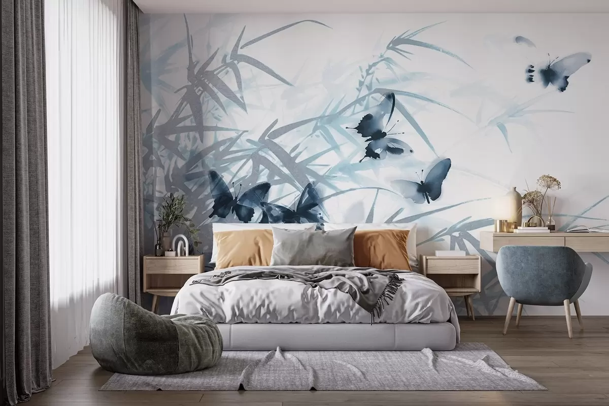 murales de pared Texturas de hojas y tallos de bambú con mariposas azules voladoras de alas transparentes w08524
