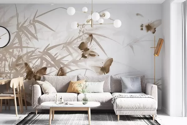 Papel tapiz Texturas de hojas y tallos de bambú con mariposas marrones voladoras de alas transparentes Nr. w08524v1