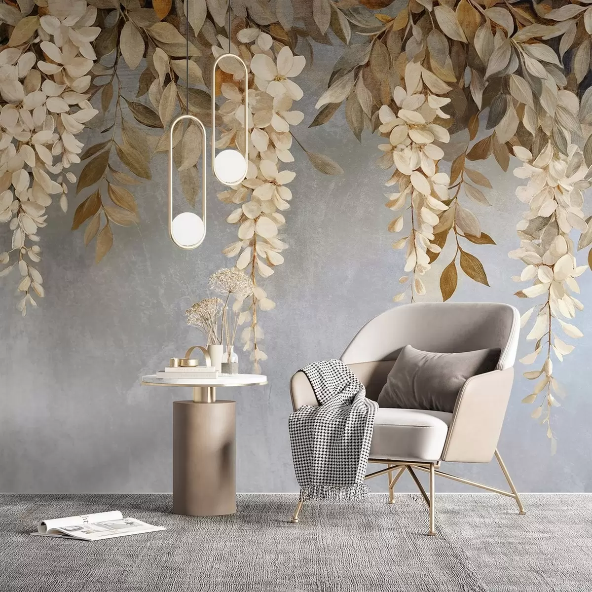 Papel tapiz Delicadas flores de glicinia blancas y beige claro con follaje en cascada sobre un fondo gris suave Nr. w08531