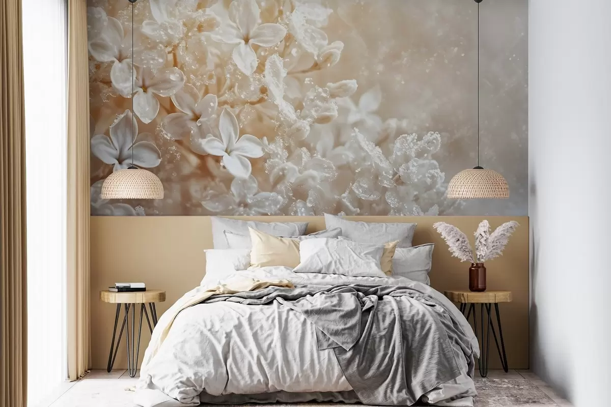 Papel tapiz Delicadas flores blancas de color lila con un suave fondo amarillo difuminado Nr. w08533
