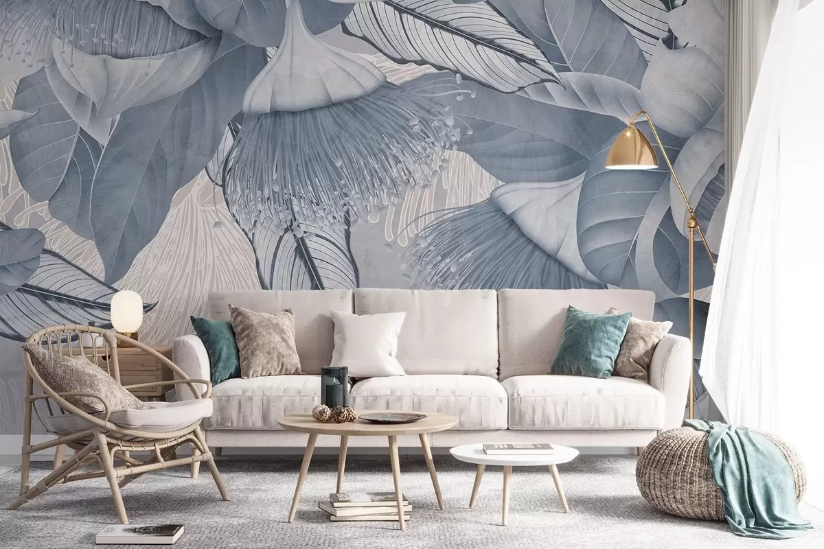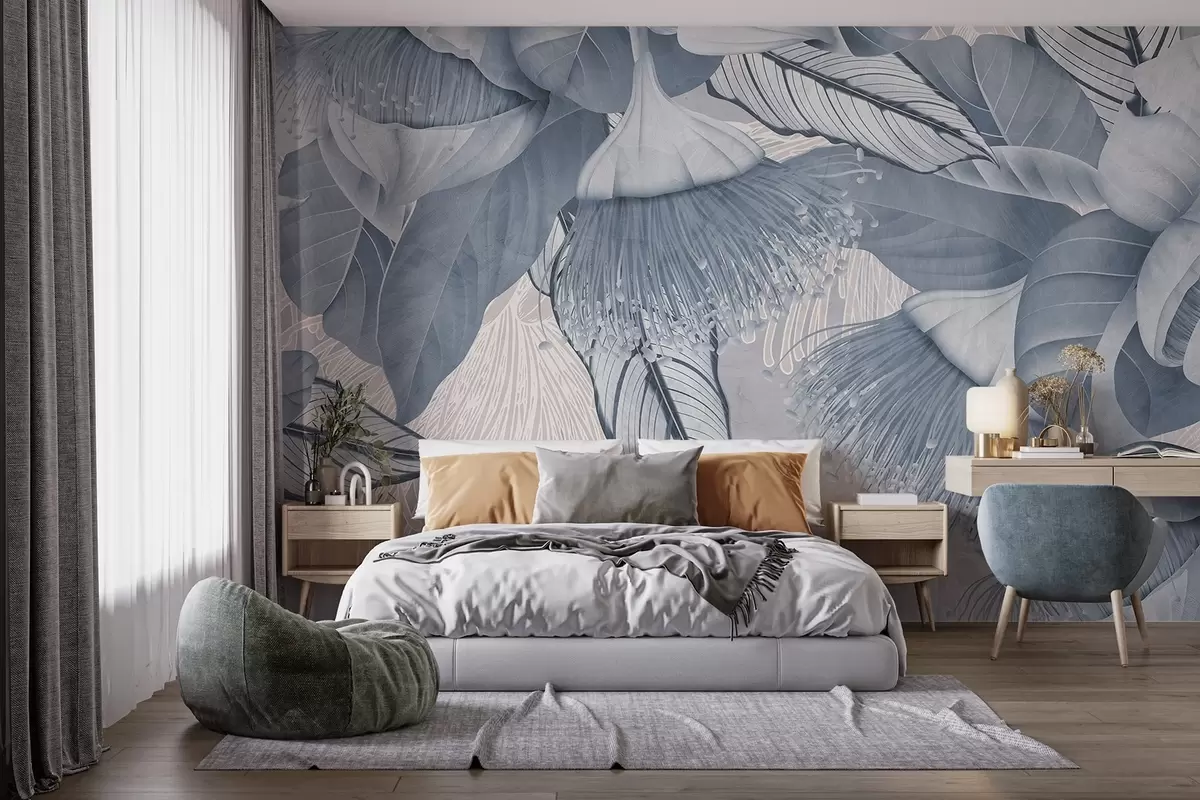 murales de pared Ilustración botánica de grandes flores azules de eucalipto con largos estambres sobre un fondo gris y blanco w08539v1