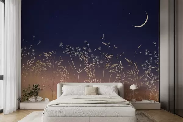 Papel tapiz Dientes de león con flores silvestres sobre un fondo de puesta de sol con un cielo azul y la luna Nr. w08567