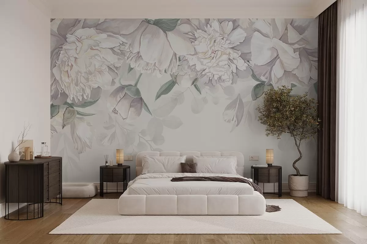 Papel tapiz Delicadas peonías blancas y rosas pastel con hojas verdes, dispuestas en un suave y romántico fondo floral Nr. w08577