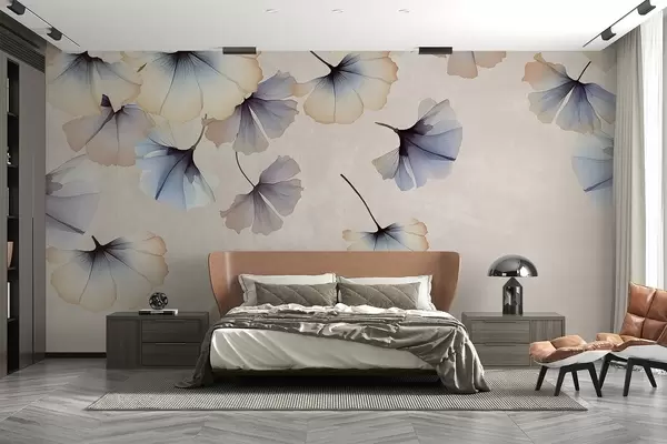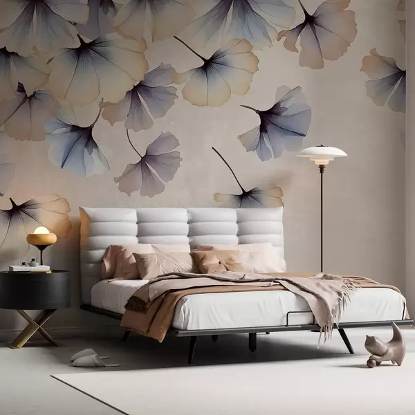 Papel tapiz Hojas de ginkgo de colores pastel azul y beige con delicados pétalos flotando en el aire sobre un fondo de texturas Nr. w08578