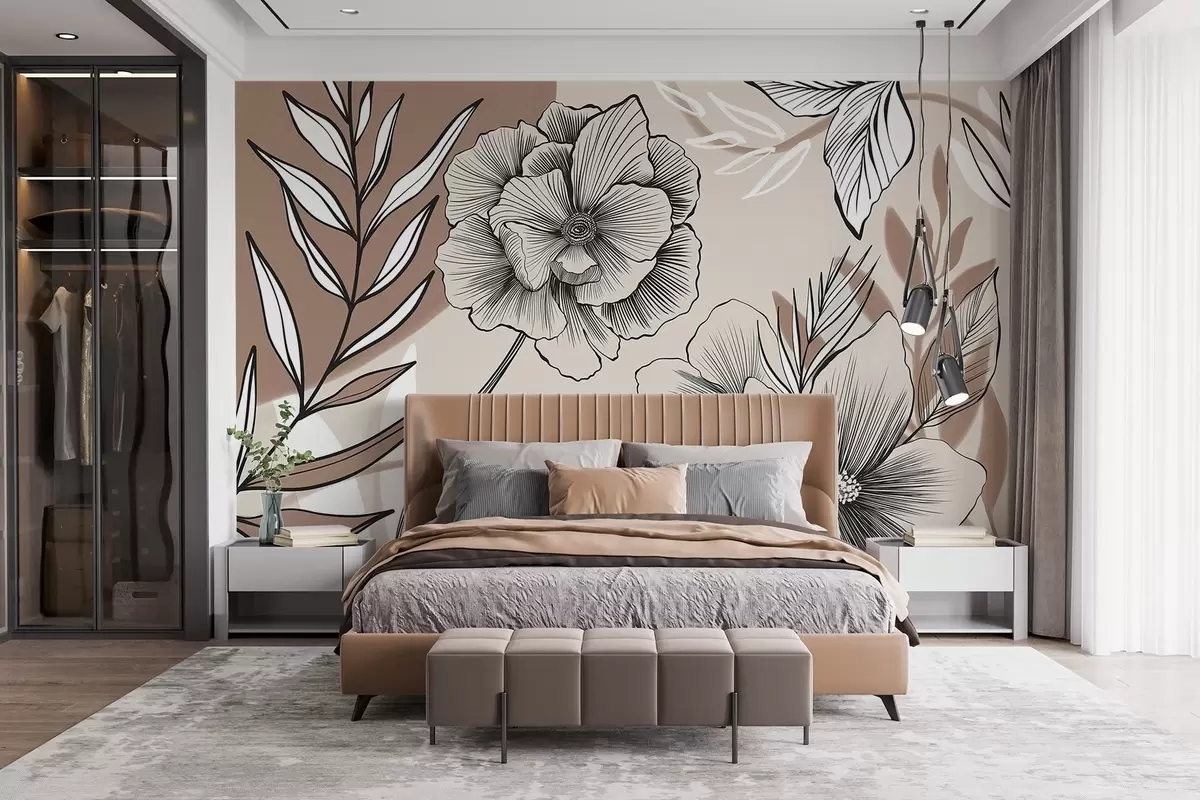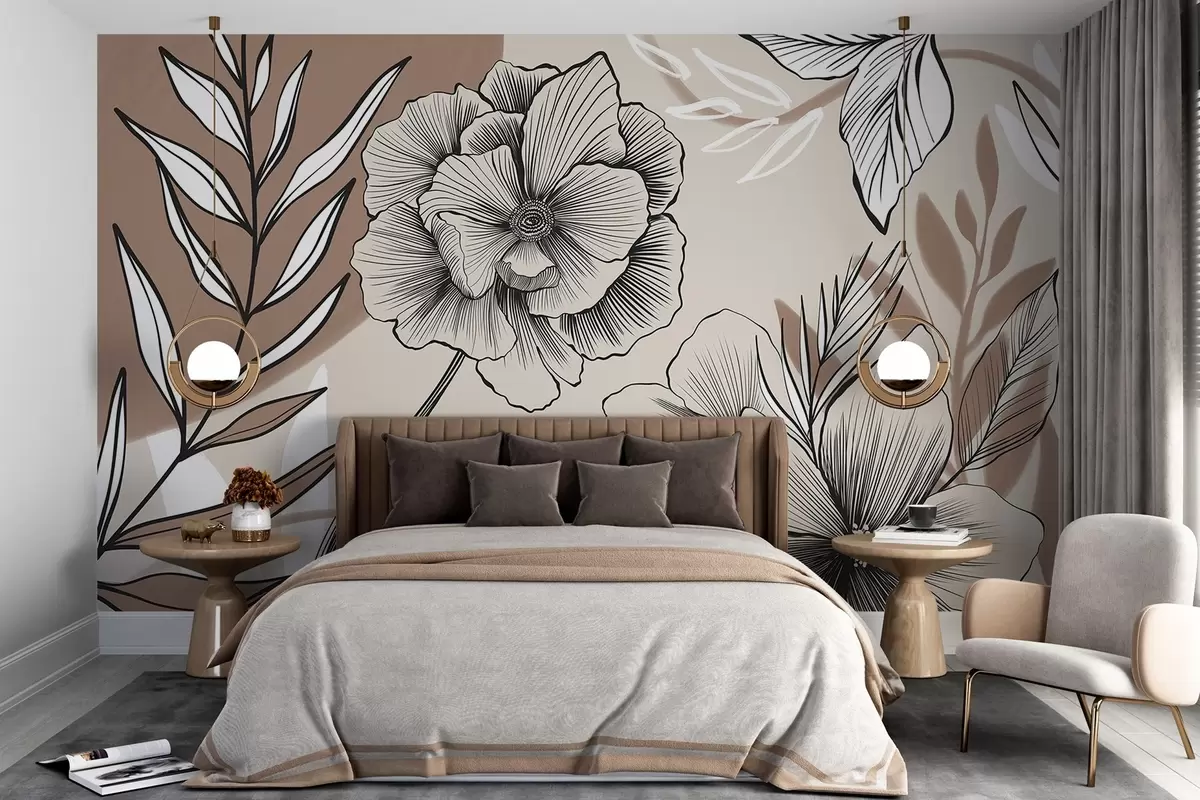 Papel tapiz Grandes flores gráficas en blanco y negro con hojas detalladas sobre un fondo abstracto beige Nr. w08580