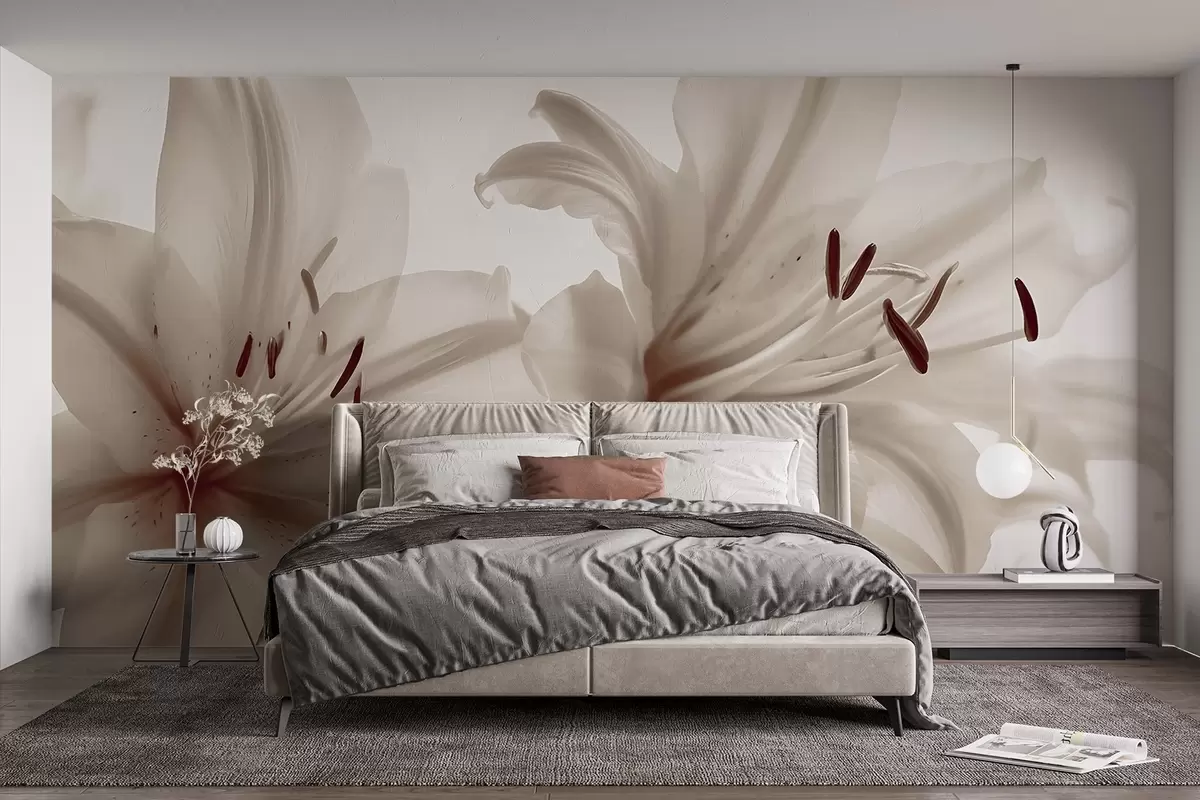 Papel tapiz Primer plano con enfoque suave de flores de lirio minimalistas de color beige sobre un fondo claro Nr. w08586v1