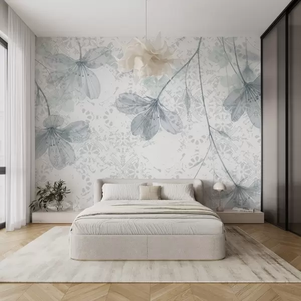 Papel tapiz Delicadas flores azules y blancas con largos tallos y pétalos sobre un fondo de textura suave y difuminada Nr. w08588