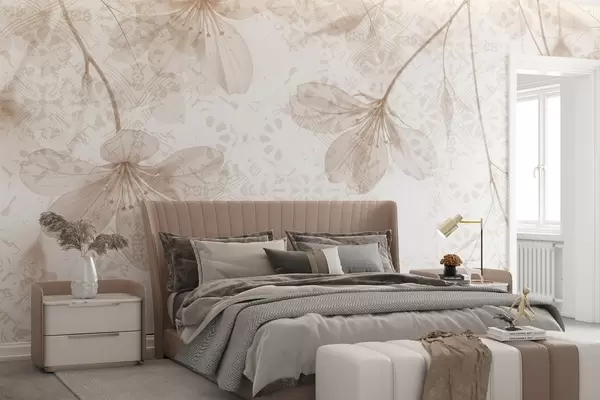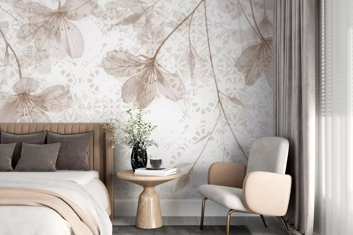 Papel tapiz Delicadas flores beige y blancas con largos tallos y pétalos sobre un fondo de textura suave y difuminada Nr. w08588v1