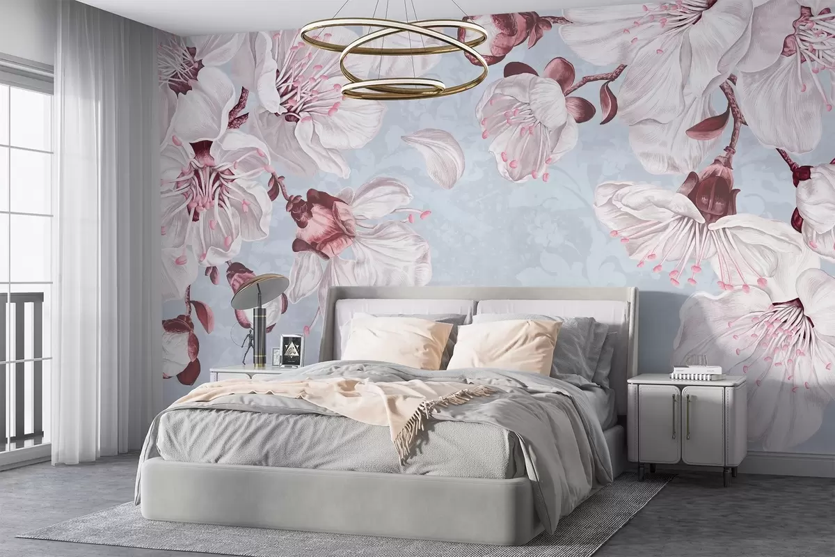 Papel tapiz Estampado floral con grandes flores de cerezo rosas y blancas sobre un fondo de textura azul claro Nr. w08601