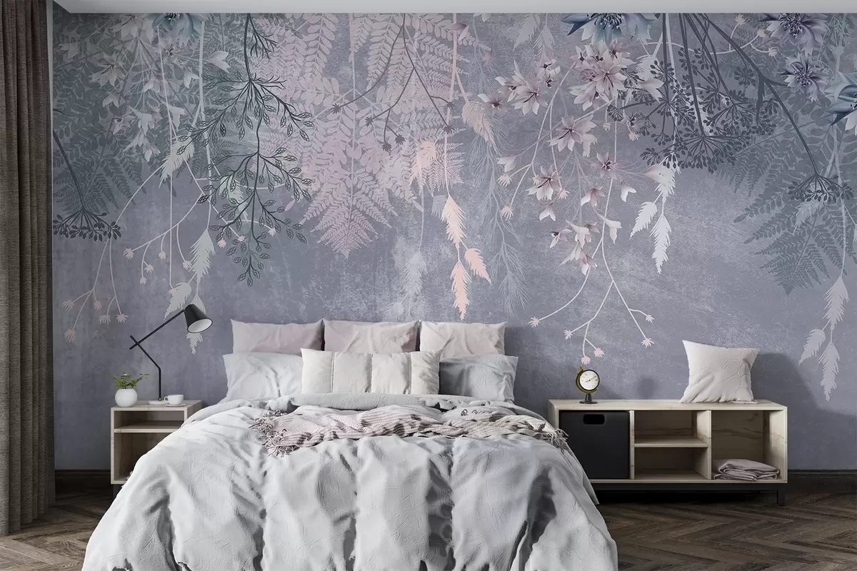 Papel tapiz Unas plantas de ensueño, delicadas y tenues, espiguillas y flores en colores pastel azulados sobre un fondo brumoso y texturizado Nr. w08606