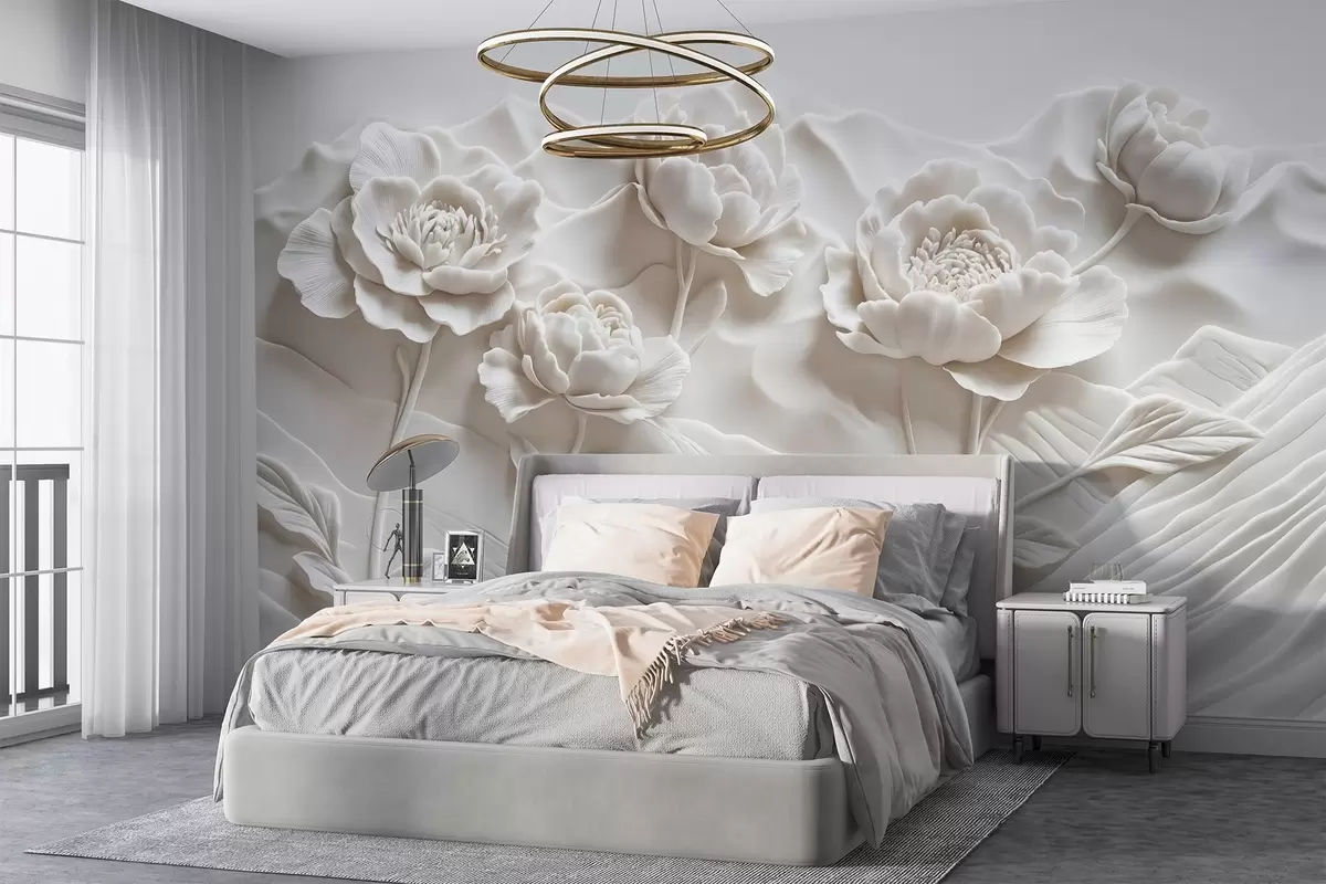 murales de pared Imitación floral blanca de escultura en relieve con grandes y detalladas flores de peonía sobre fondo liso w08612