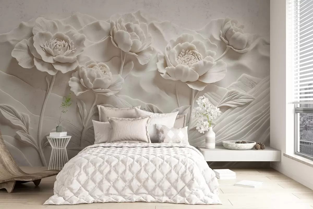 Papel tapiz Imitación floral blanca de escultura en relieve con grandes y detalladas flores de peonía sobre fondo liso Nr. w08612