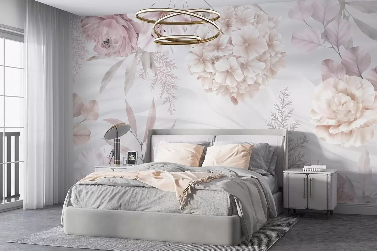 Papel tapiz Un estampado floral suave y abstracto con grandes flores rosas y blancas, delicadas hojas y una paleta de colores pastel apagados Nr. w08651