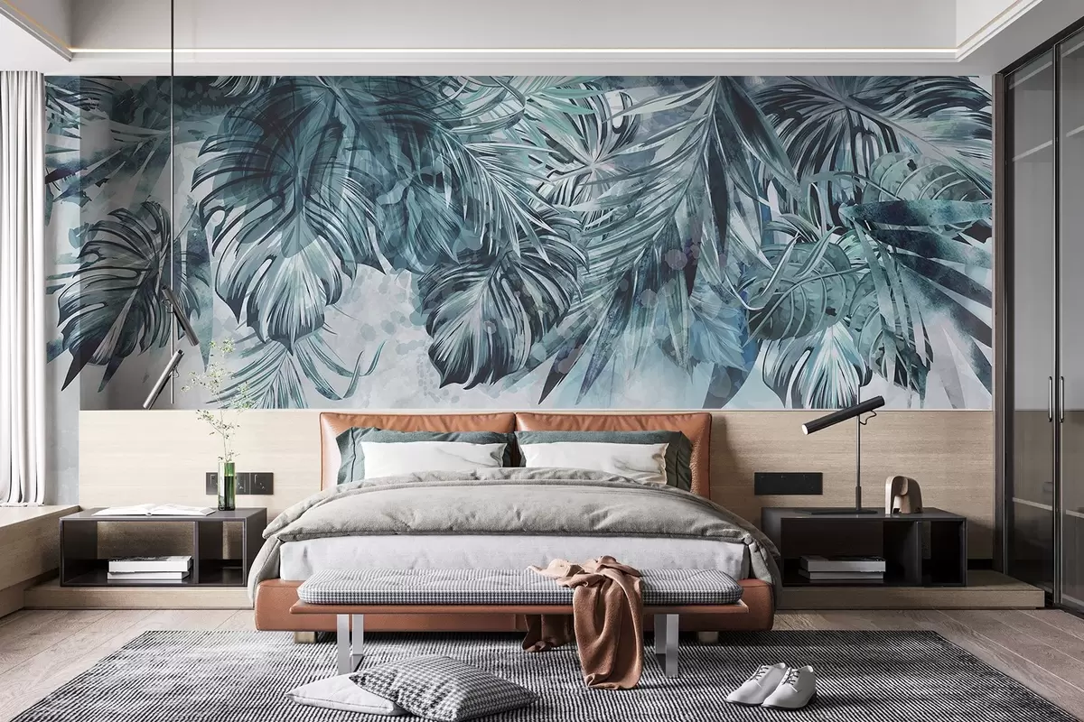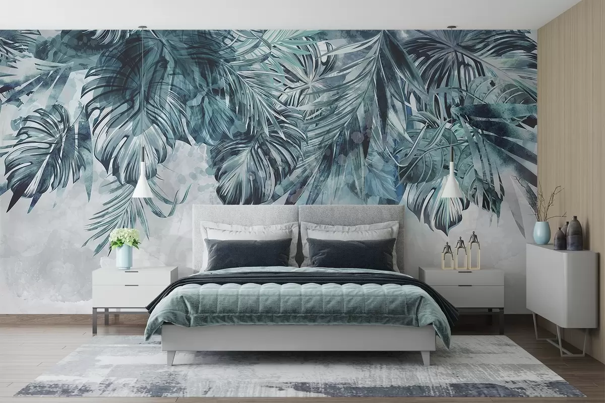 Papel tapiz Hojas tropicales en tonos verde azulado y verde, en cascada desde la parte superior, sobre un fondo claro y texturizado Nr. w08667