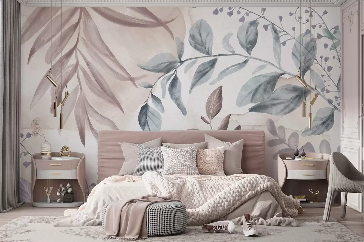 Papel tapiz Estampado botánico con hojas y ramas florales en suaves colores pastel, sobre fondo de acuarela Nr. w08668