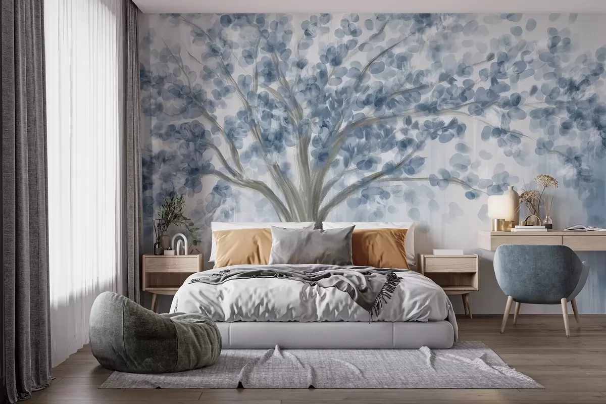 Papel tapiz Un gran árbol con hojas suaves y abstractas en azul sobre un fondo claro y neutro que realza los tonos del árbol Nr. w08669v1