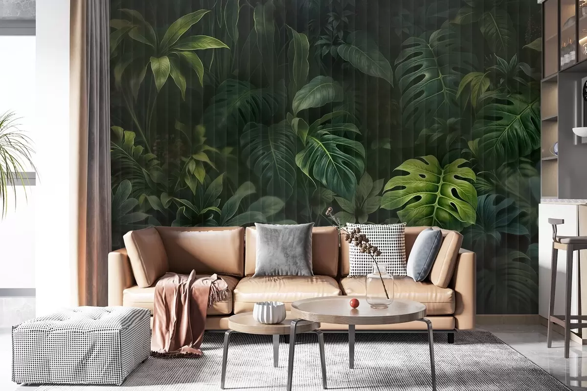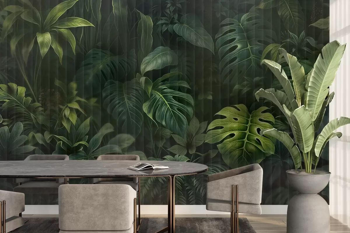 Papel tapiz Estampado tropical oscuro difuminado y texturizado con varias hojas verdes, incluidas hojas de monstera y de palmera Nr. w08673