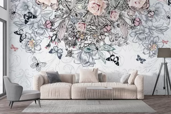 Papel tapiz Un dibujo floral con rosas rosadas y varias flores y mariposas con intrincado arte lineal sobre fondo texturizado Nr. w08674