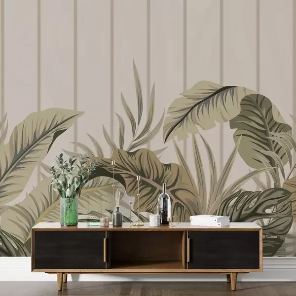 murales de pared Motivo de follaje tropical en tonos verdes y beige apagados sobre fondo claro con líneas verticales w08683