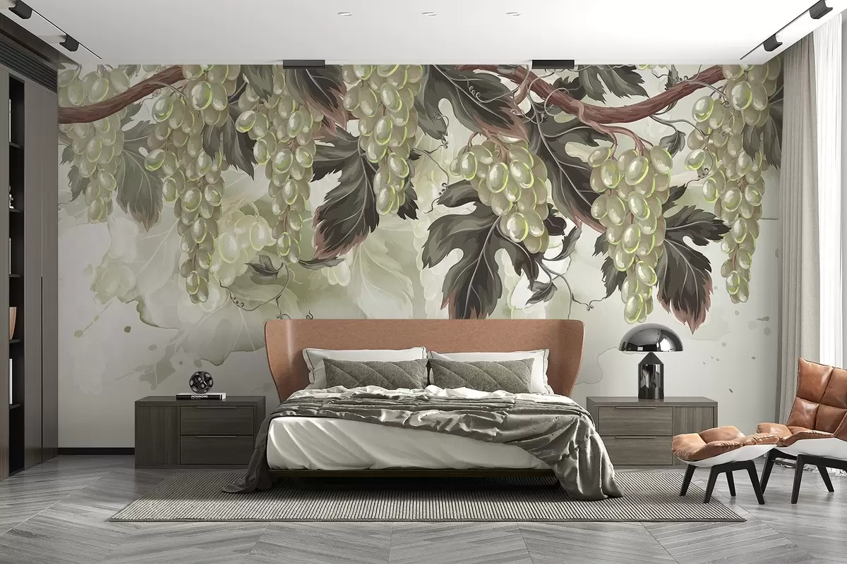 Papel tapiz Uvas colgando de una parra con hojas verdes, sobre un fondo claro con texturas tipo acuarela Nr. w08696