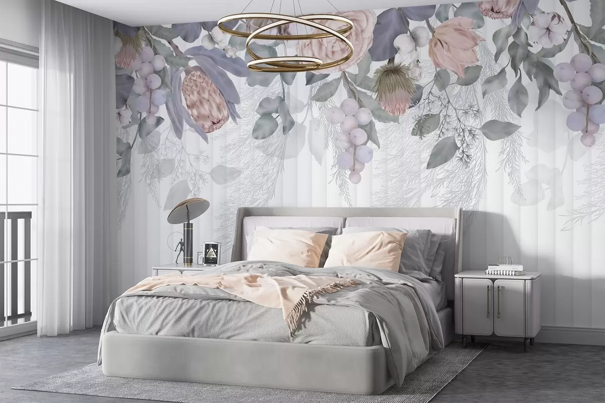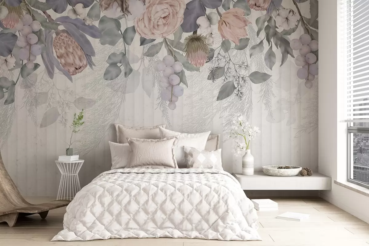 Papel tapiz Un floral de rosas rosadas en tonos pastel, flores de protea, ramas de eucalipto y bayas sobre fondo texturizado Nr. w08700