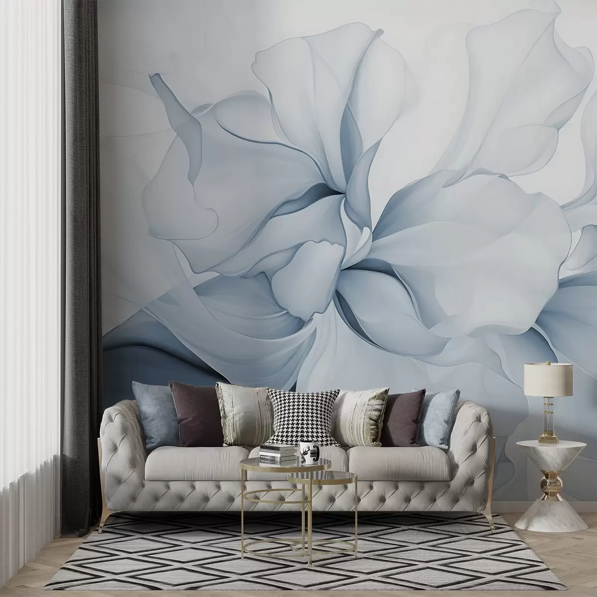 Papel tapiz Pétalos florales abstractos fluidos de formas translúcidas y estratificadas en colores pastel, en tonos azules Nr. w08701v2