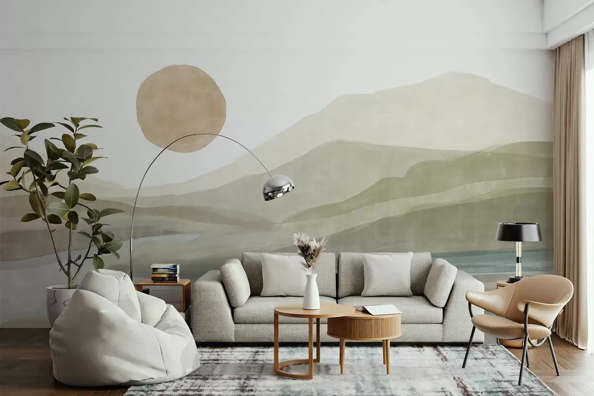 murales de pared Un paisaje de montañas en capas con una suave pendiente, un río serpenteante, un sol naranja apagado en el cielo w08702