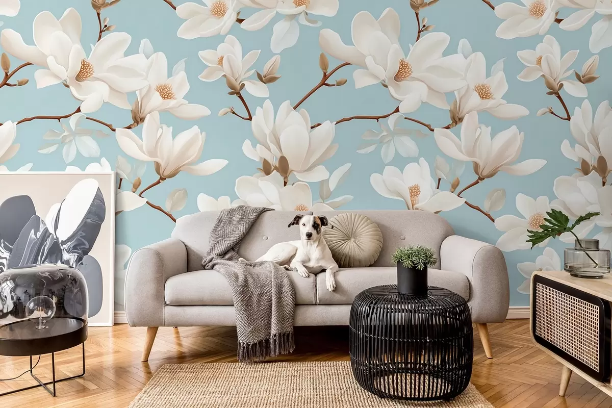 Papel tapiz Patrón de flores blancas de magnolia, fondo azul pastel, hojas y ramas blancas Nr. w08726