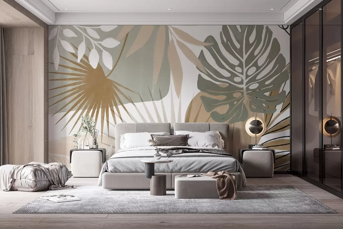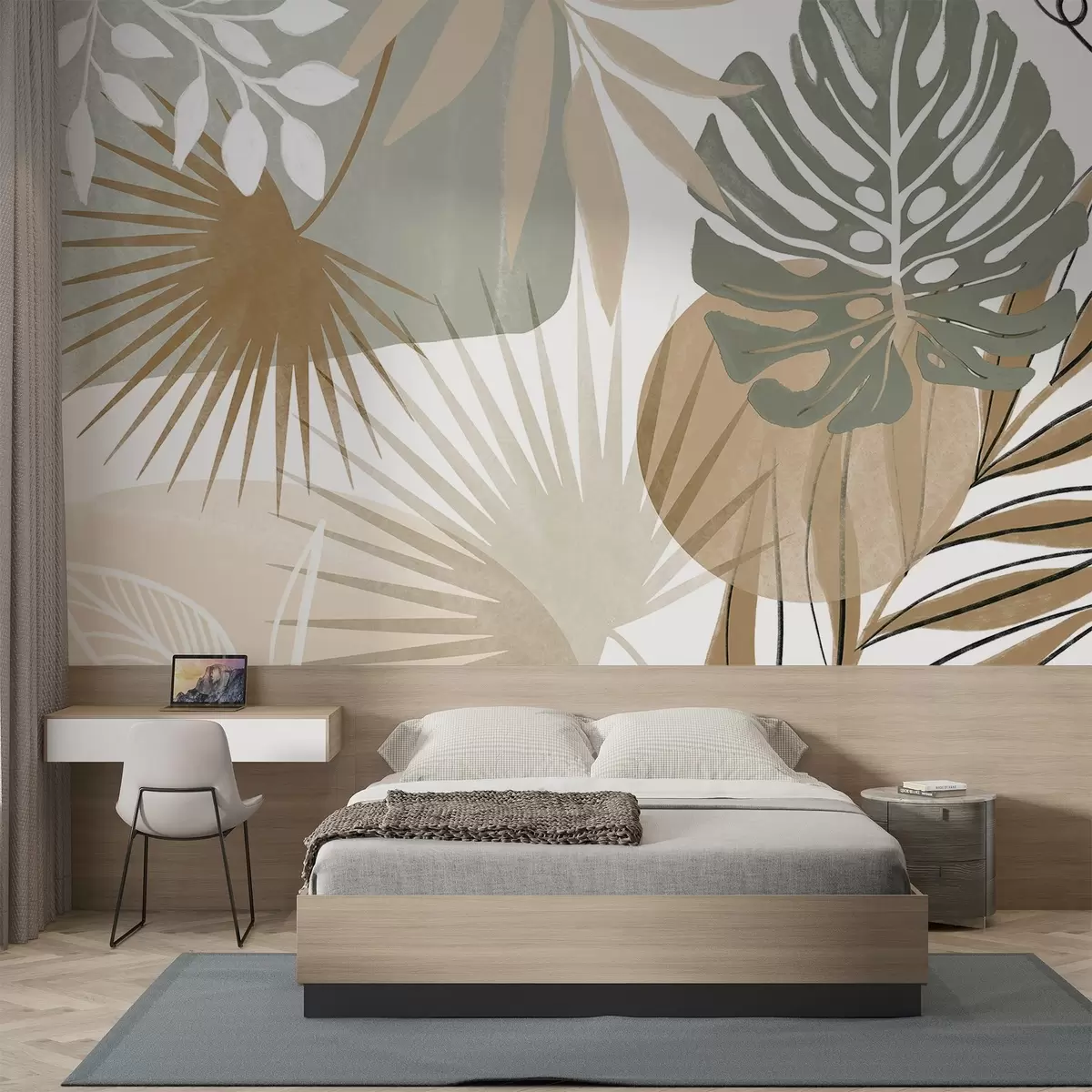Papel tapiz Diseño abstracto con varias hojas tropicales en tonos tierra, verde, beige y crema Nr. w08738v1