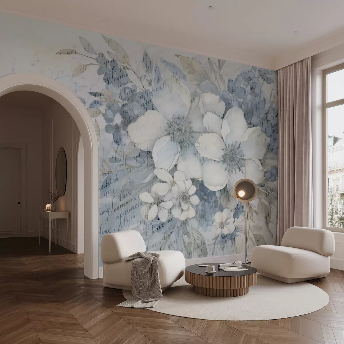 Papel tapiz Una suave imitación de pared con textura de flores blancas y azules, sobre un fondo pálido con un tenue texto manuscrito Nr. w08771