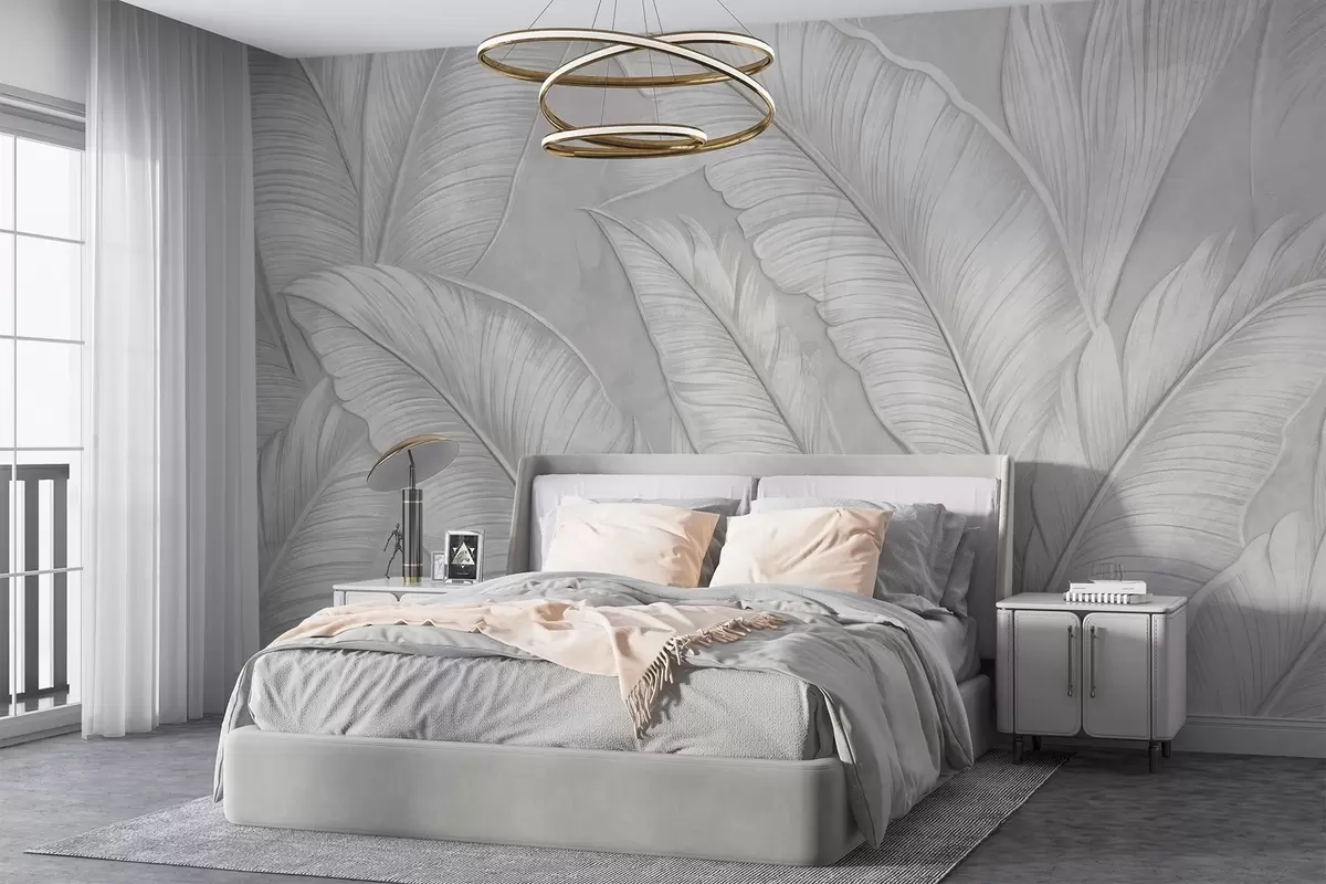 Papel tapiz Grandes hojas tropicales detalladas con gran textura en un color gris claro monocromático de estilo loft Nr. w08772