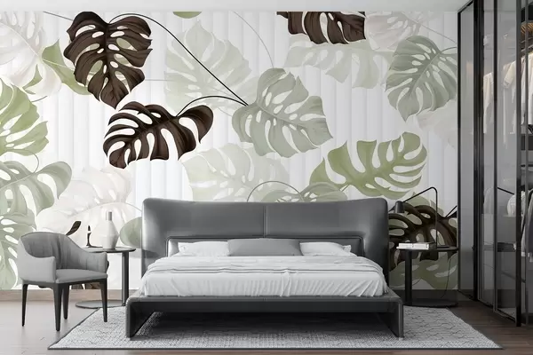 Papel tapiz Hojas de Monstera en tonos verdes, blancos y marrones oscuros, sobre un fondo claro de textura rayada Nr. w08773