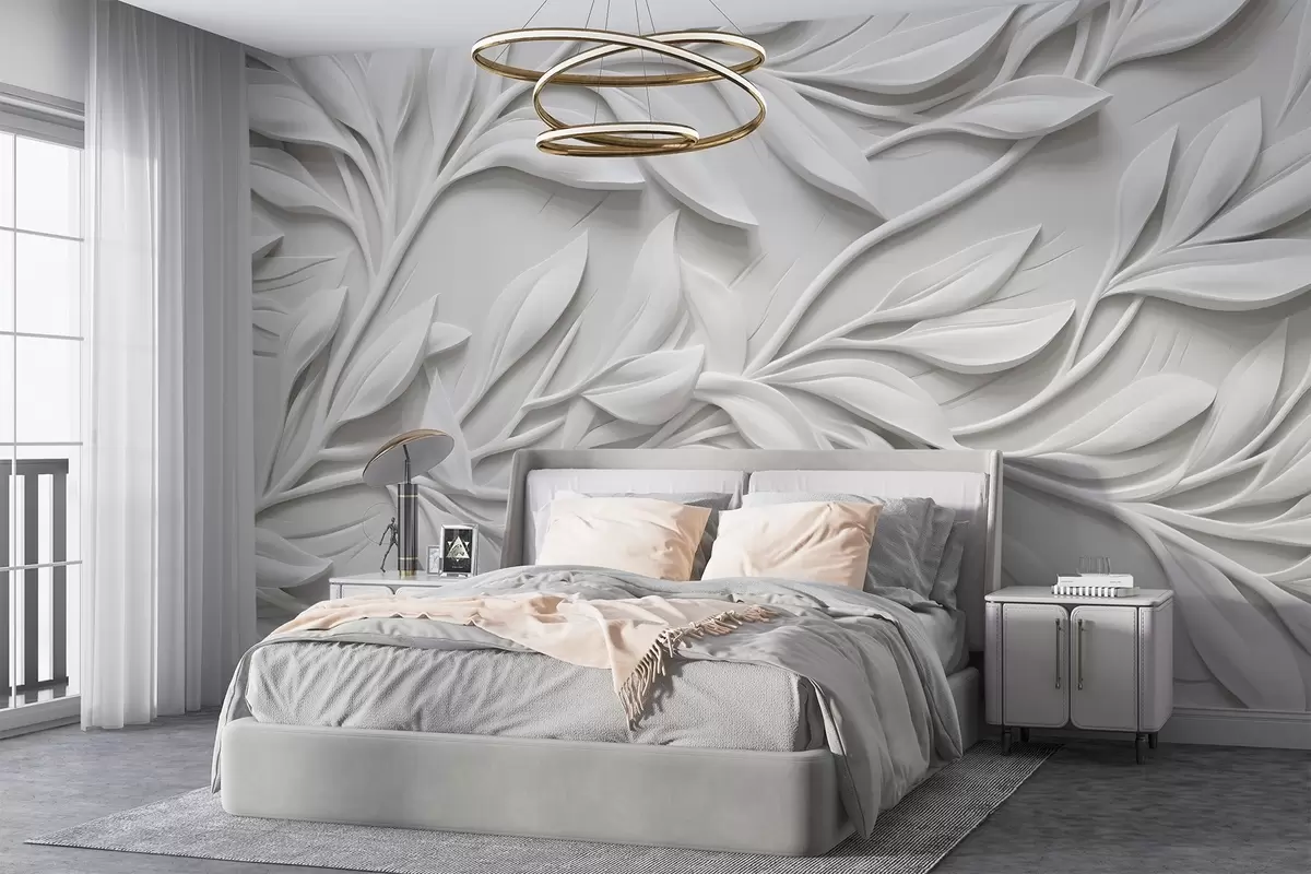 Papel tapiz Estampado blanco texturizado con hojas y ramas , creando un efecto de imitación de volumen sobre un fondo texturizado Nr. w08778