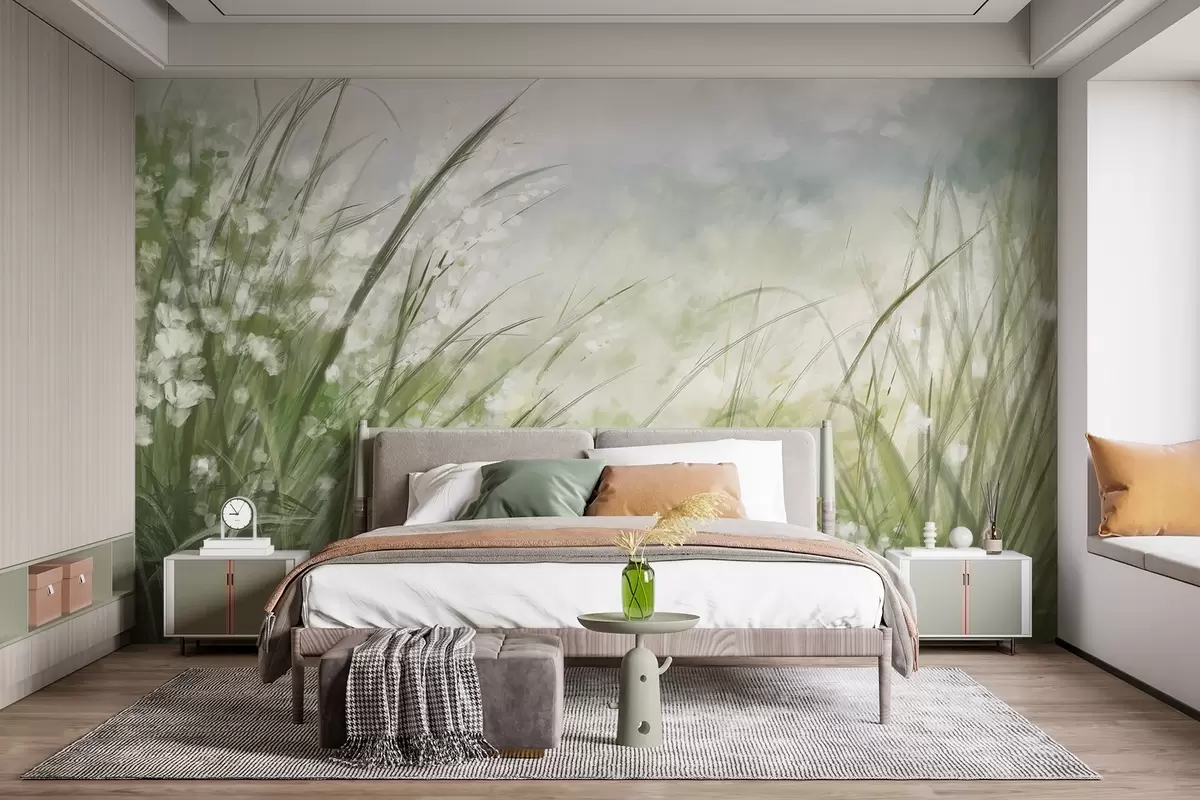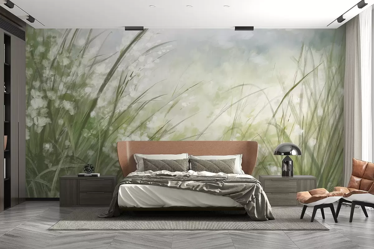 Papel tapiz Exuberante hierba verde con delicadas flores blancas, estampado suavemente difuminado con tonos claros, creando un paisaje tranquilo Nr. w08779